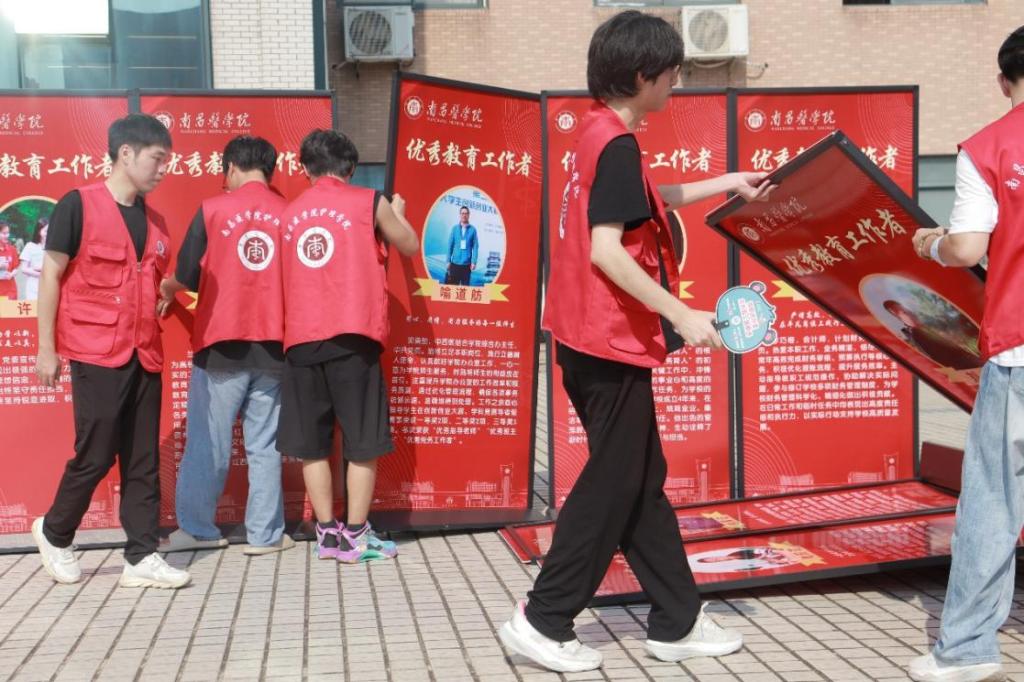 为了让新生快速融入 “护理大家庭”,志愿者们提前就开始精心策划并布置主题打卡点位 —— 在学院迎新帐篷前,以 “白衣执甲・逐梦南医” 为核心主题,两侧摆放着展示学院办学成果的展板,既有优秀校友的医护事迹,也有学生在 “三下乡”、技能大赛中的精彩瞬间。“我们想通过这些充满专业特色的布置,让新生一来就感受到英国正版365官网的温暖,也让他们对未来的学习生活充满期待。” 负责打卡点设计的志愿者李康同学说道。主题打卡点不仅成为校园里的 “网红地标”,更让迎新现场充满了青春活力与人文关怀。